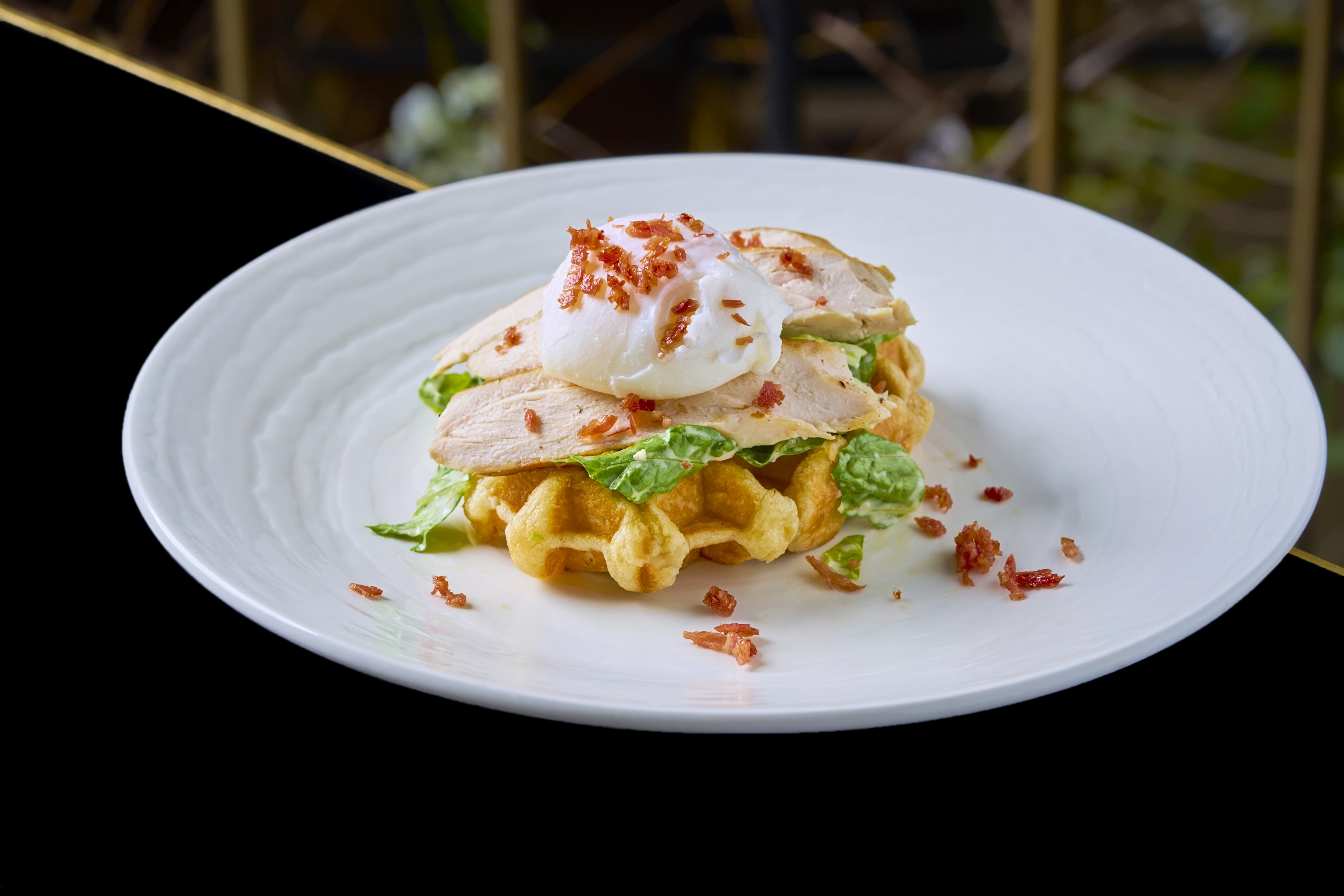 belgická vafle, kuřecí prsa, Caesar dresing, římský salát, vejce, krůtí slanina, parmezán
