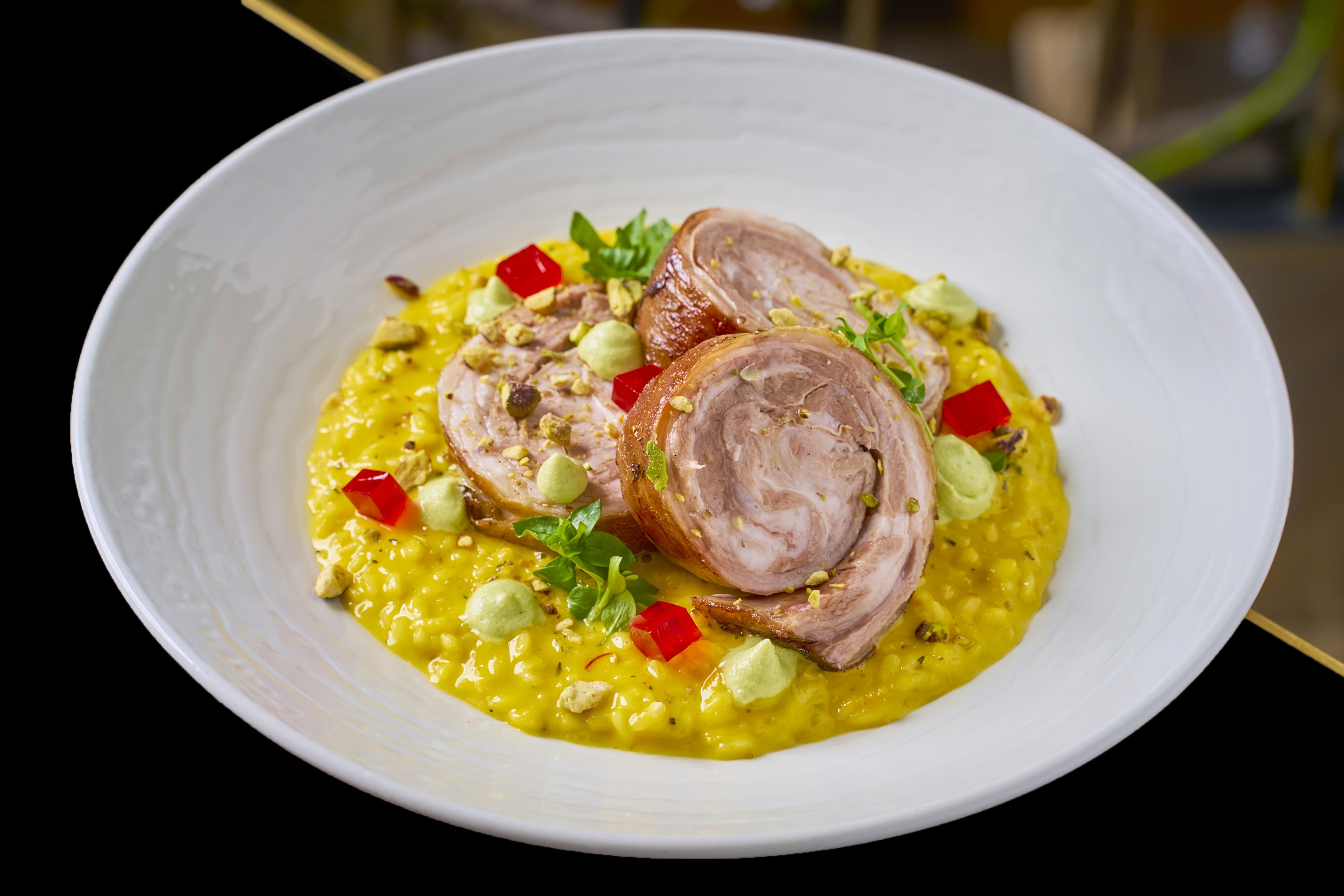 Šafránové risotto s jehněčí roládou a pistáciemi